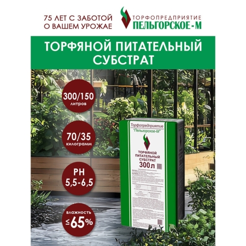 №300л Субстрат Пельгорское-М торфяной питательный 300 Торфяной питательный субстрат готовится на основе верхового торфа низкой степени разложения с последующей очисткой от крупных включений и разделением на фракции. Для нейтрализации торфа применяется известняковая мука. Торф обогащен питательными веществами комплексного микрогранулированного удобрения. Баланс кислотности субстрата от 2,70 до 6,5, в зависимости от потребности для разных видов растений. Состав – верховой торф, природные минеральные компоненты, полный набор элементов питания. Вид продукции – грунты, мульчирующие. Вид работ – посадка, пересадка, подкормка, высадка рассады, мульчирование. Вид растений – цветочные, комнатные растения, газоны, хвойные, овощные, ягодные, плодовые