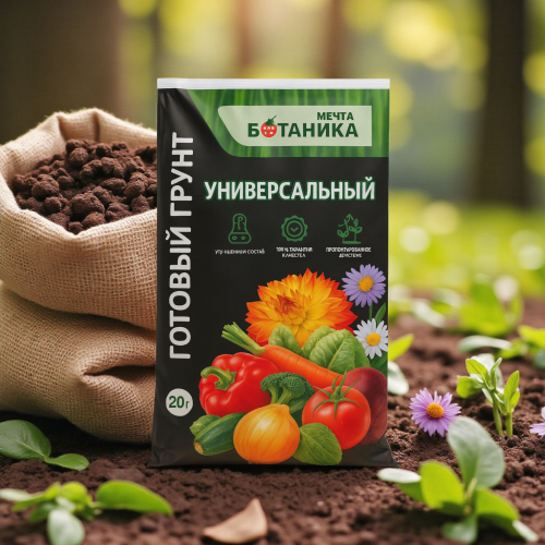 №20л Мечта Ботаника универсальный грунт Мечта Ботаника универсальный грунт — готовый торфяной грунт для овощей, цветов, рассады и декоративных растений, подходит для открытого грунта и теплиц, содержит необходимые питательные вещества.