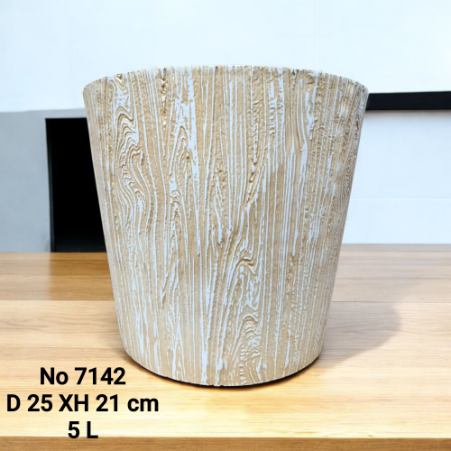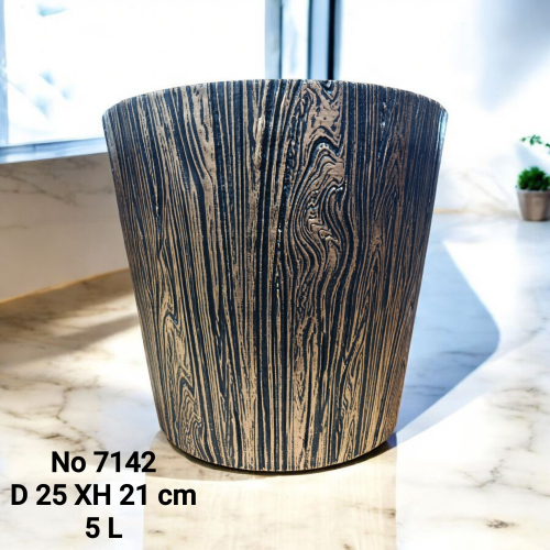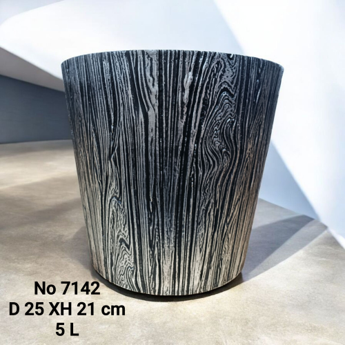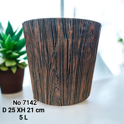 №7142 ЗЛ No 7142 Стильный цветочный горшок с текстурой под дерево. Выполнен в тёплых коричнево-чёрных оттенках, выглядит натурально и современно. Диаметр 25 см, высота 21 см, объём 5 л — отлично подходит для комнатных растений и гармонично впишется в любой интерьер на