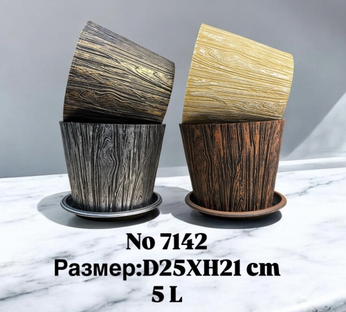 №7142(5л) G7142 Стильный цветочный горшок с текстурой под дерево. Выполнен в тёплых коричнево-чёрных оттенках, выглядит натурально и современно. Диаметр 25 см, высота 21 см, объём 5 л — отлично подходит для комнатных растений и гармонично впишется в любой интерьер на