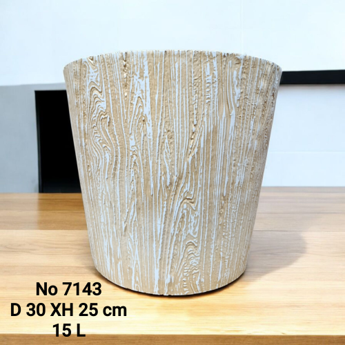 №7143 ЗЛ No 7143 Элегантный цветочный горшок с выразительной текстурой под натуральное дерево. Глубокий тёмный цвет с контрастными прожилками придаёт изделию стильный и современный вид. Диаметр 30 см, высота 25 см, объём 15 л — идеально подходит для крупных комнатных растений и станет эффектным акцентом в интерьере дома или офиса.