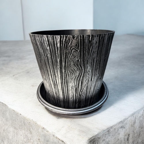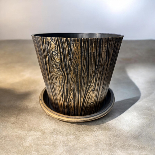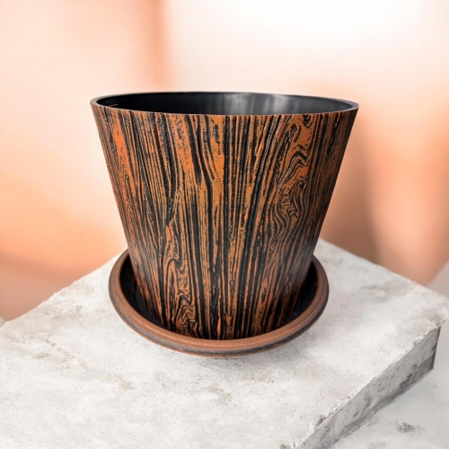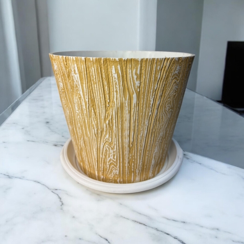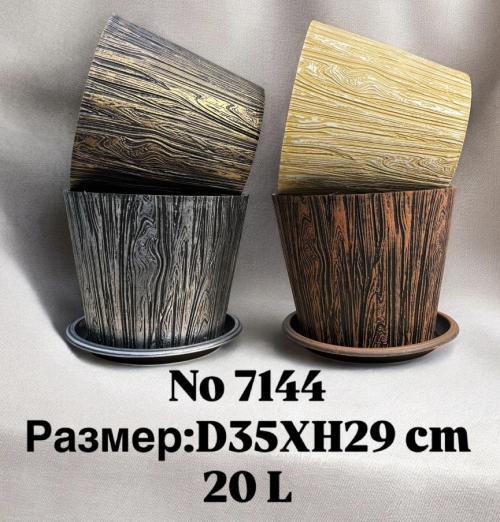 №7144(20л) G7144 Крупный цветочный горшок с фактурной поверхностью под светлое дерево. Натуральные бежево-белые оттенки создают ощущение уюта и лёгкости, подчёркивая современный и скандинавский стиль. Диаметр 35 см, высота 29 см, объём 20 л — отлично подходит для больших растений и станет выразительным элементом интерьера дома, офиса или террасы.