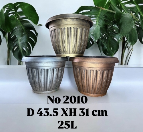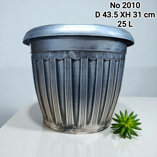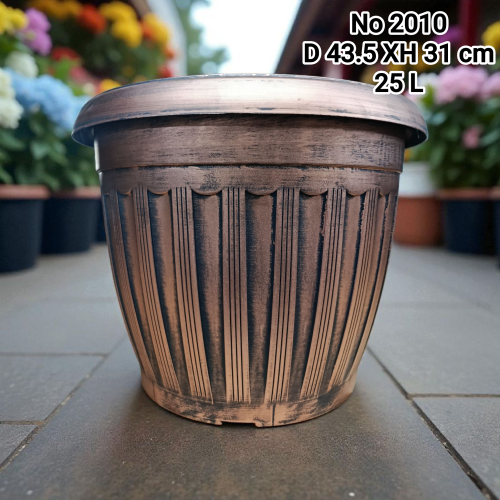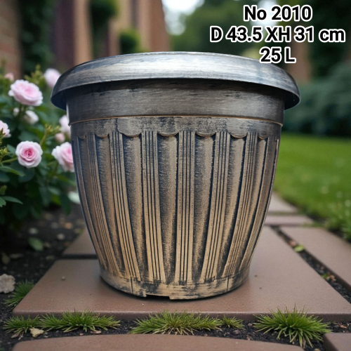 №2010 No 2010 Большой декоративный цветочный горшок в классическом стиле с выразительным рельефным узором. Основной цвет — тёмно-серый с эффектом состаренной поверхности, дополненный золотистой патиной, которая подчёркивает рельеф и придаёт изделию благородный, декоративный вид. Диаметр 43,5 см, высота 31 см, объём 25 л — идеально подходит для крупных растений, кустарников и оформления сада, террасы или входной зоны
