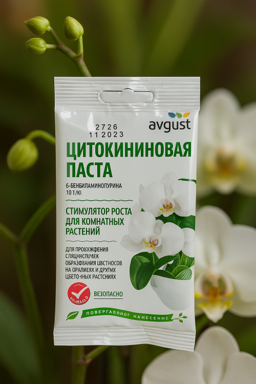 №8866 Цитокининовая паста Цитокининовая паста — гормональный стимулятор роста для растений. Активизирует пробуждение спящих почек, стимулирует образование боковых побегов и цветоносов, ускоряет рост и развитие растений. Особенно эффективна для орхидей, фиалок, роз и других декоративных культур. Применяется точечно, в минимальных количествах