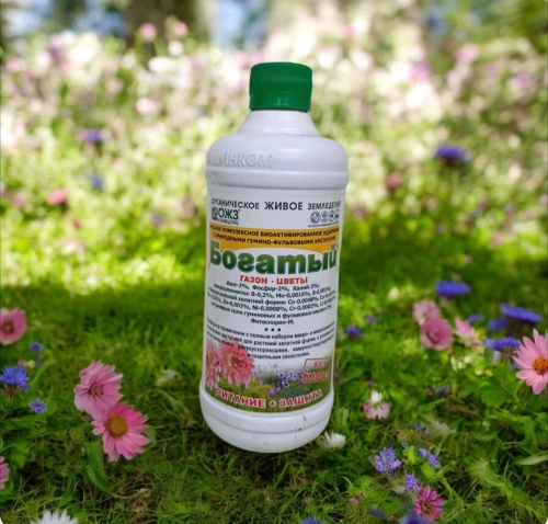 №5459 Богатый газон цветы «Богатый» ОЖЗ для газона и цветов — органическое жидкое удобрение для ухода за газонными травами, садовыми и комнатными цветами.