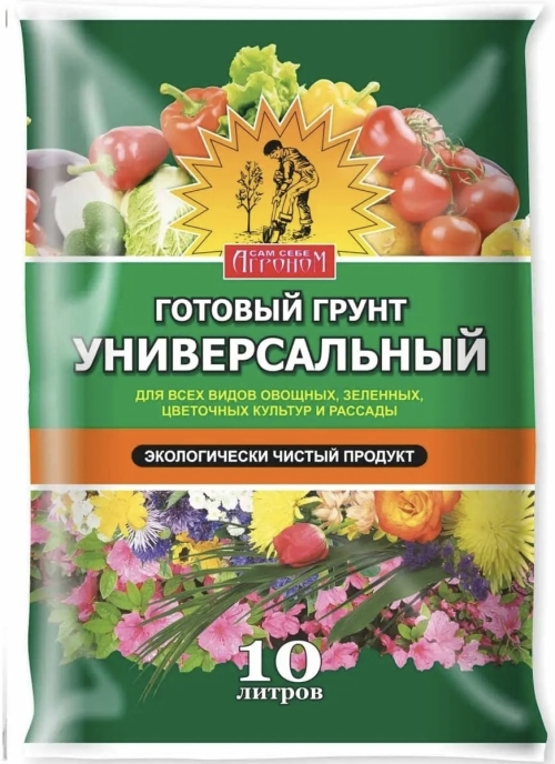 №10л Грунт Сам себе Агроном 10л Универсальный готовый почвогрунт с нейтральным уровнем pH идеально подойдёт для выращивания рассады овощных и цветочных культур в качестве заменителя дерновой земли для получения рассадного грунта, а также как основная заправка гряд и клумб, будет незаменим и для посадки ягодных кустарников и плодовых деревьев.
