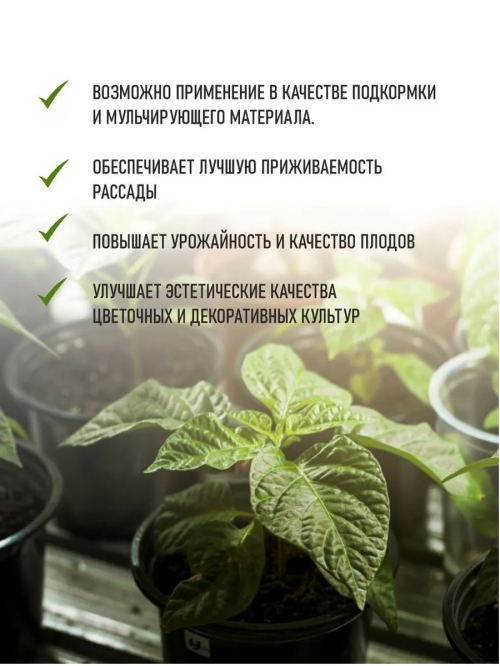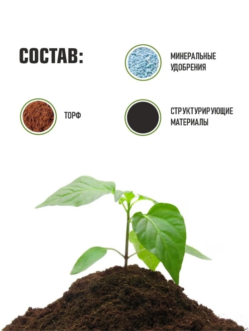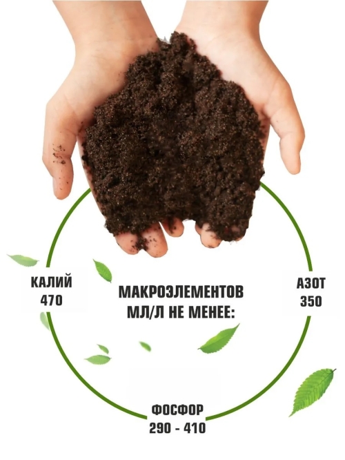 В состав почвогрунта входят: биогумус, макро- и микроэлементы, азотофиксирующие бактерии, ферментный комплекс. Способствует развитию оптимальной микрофлоры.