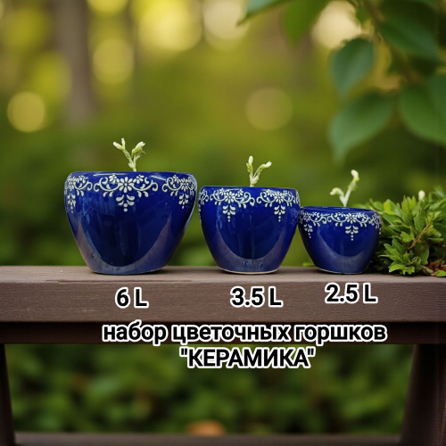 Одно тоный темно синий Кирамический горшок в наборе 3в1 М-15х12 С-20х16 Б-25х19
